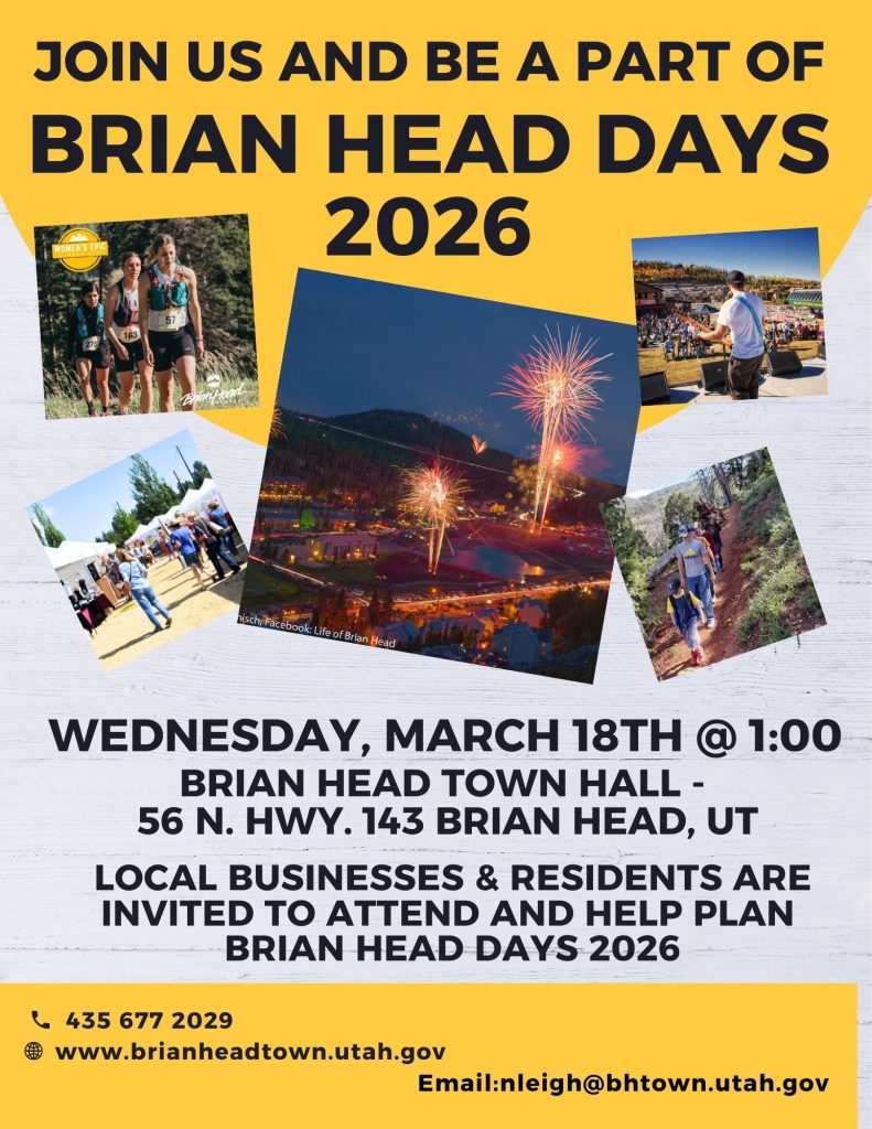 Come and join us as we plan the first annual Brian Head Days for 2026. A meeting to collabrate, educate and bring ideas for events for the first annual Brian Head Days event. Plan to join us Wednesday, March 18, 2026 @ 1:00pm at the Brian Head Town Hall located at 56 N. Hw. 143, Brian Head, UT 84719. For more information, please contact Nancy Leigh, Town Clerk at nleigh@bhtown.utah.gov or by calling the Town offices at 35-677-2029 during normal business hours.